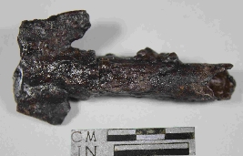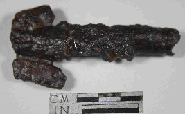 | Description / विवरण | An arrow head having its broad top. It is T-shaped and has rough surface. Its colour is black and highly corroded. |