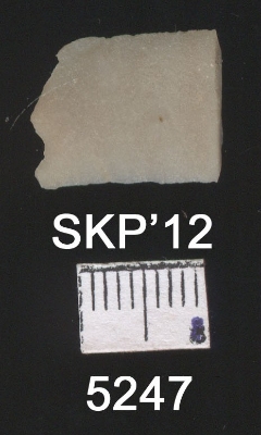 | Description / विवरण | This is a chert blade fragment with a slight bend at the middle flaked ridged dorsal side. Trapezium cross section one end and flaked and denticulated on the other end, sharp margins. |
