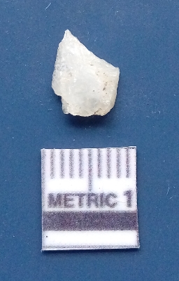 | Description / विवरण | The quartz flake has irregular fracture pattern and sharp flaked edges as a result of lithic knapping activity. The piece is pale, with surface flake scars and a bulbous end. |