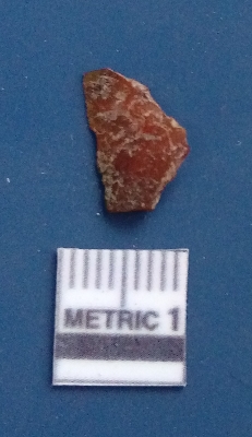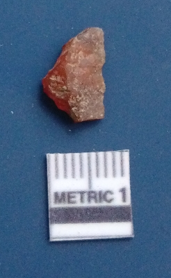 | Description / विवरण | The carnelian flake is red in color, with angular flaked edges and a bulbous end. The piece has sharp pointed end and a crypto-crystalline matrix. The piece is reddish in color; with silica base. |