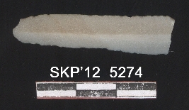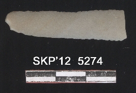 | Description / विवरण | This is a chert blade, tapered at one end, trapezium cross section on the other end. There is a bend downwards at the tapered end. Used ware marks on the lateral margins, flaked ridges on the dorsal side. |