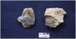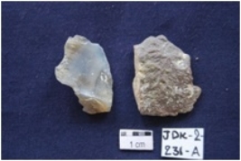 | Description / विवरण | One Flake, made on Chert, by-product of stone tool manufacturing, another Flake with use-wear marks along the cutting edge, prepared platform, bulb absent on ventral side, give heat-treatment. |