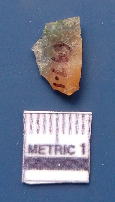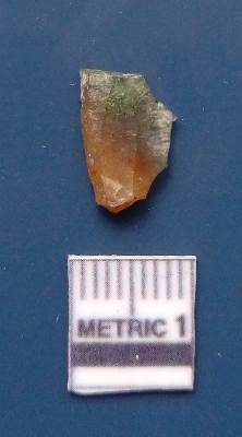 | Description / विवरण | It is a blade fragment. The sides are sharp and retouched. It is greenish orange in colour and is trapezoidal in cross - section. The striking platform and the bulb of percussion is clearly visible. The ridges are clearly seen on the dorsal surface while the ventral surface is plain. |