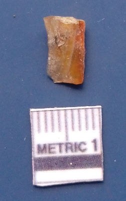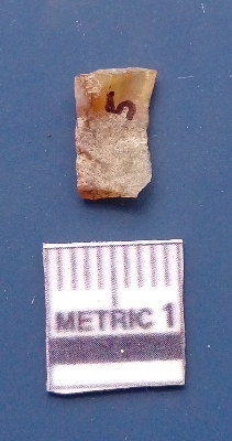 | Description / विवरण | It is a blade fragment. The sides are sharp and retouched. It is orangish white in colour and is triangular in cross - section. The striking platform and the bulb of percussion is clearly visible. The ridges are clearly seen on the dorsal surface while the ventral surface is plain. |