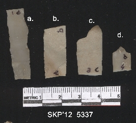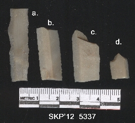 | Description / विवरण | Broken chert blade. The ridges can be clearly seen and the ventral surface in plain. Trapezium in cross section. |