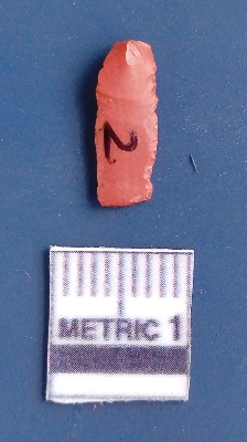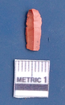 | Description / विवरण | It is a blade fragment. The sides are sharp and retouched. It is reddish in colour. The striking platform and the bulb of percussion is clearly visible. The ridges are clearly seen on the dorsal surface while the ventral surface is plain. It is triangular in cross - section. |