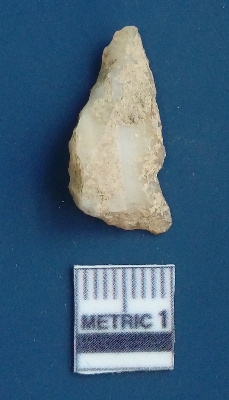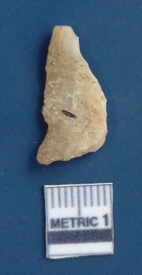 | Description / विवरण | It is a blade flake. The sides are sharp and retouched. It is creamish white in colour. The striking platform and the bulb of percussion is clearly visible. The ridges are clearly seen on the dorsal surface while the ventral surface is plain. |