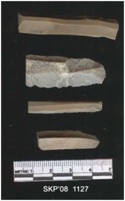 | Description / विवरण | Broken chert flint blade. It is rectangular in structure. The ridges and retouching can be seen. Triangular in cross section. The ventral sides are plain. |