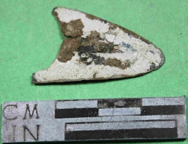 | Description / विवरण | It is a broken fragment of copper arrow head with fragile and rusting. An arrow head is the point of an arrow,usually sharpened. Its colour is dark grey and rough surface. |