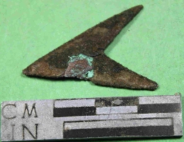 | Description / विवरण | It is a broken fragment of copper arrow head with fragile and rusted. An arrow head is the point of an arrow,usually sharpened. Its colour is dark grey and rough surface. |