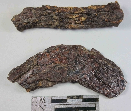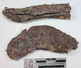 | Description / विवरण | Heavily incrusted curved sickle with broken handle. |