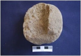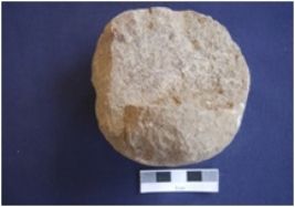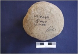 | Description / विवरण | Round shaped Hammer stone, made on Sandstone, broken on one side, pitting marks on one side. |
