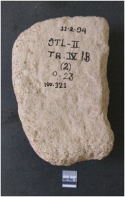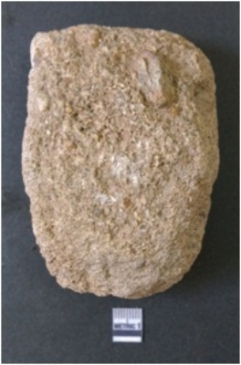 | Description / विवरण | The sandstone grinding stone is half broken, and rectangular in shape. The piece is pale brown in color and has battering marks around the edges. |