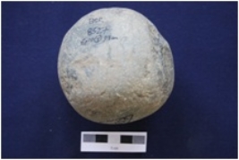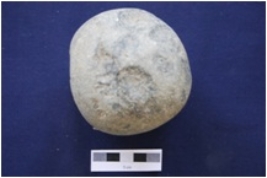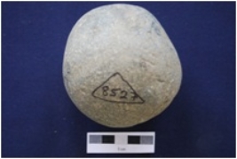 | Description / विवरण | A polished circular pestle stone. Supposed finger impressions on one side. |