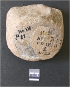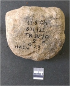 | Description / विवरण | The sandstone grinding stone has rounded edges, and a rough rectangular shape. The stone is pale grey in color. |
