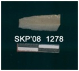 | Description / विवरण | Broken chert blade. It is triangular in cross section. The ridges can be seen clearly and the retouches can be seen. |