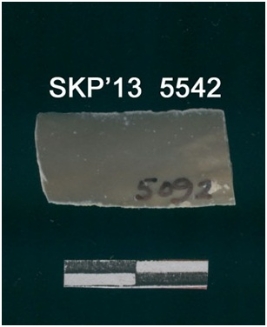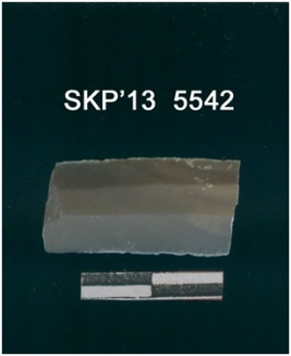 | Description / विवरण | Broken chert blade. It is rectangular in structure and is trapezium in cross section. The ridges can be seen clearly. The sides are retouched and the ventral surface is plain. |