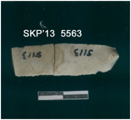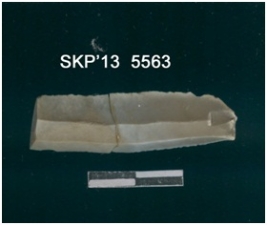 | Description / विवरण | Broken chert blade. It is rectangular in structure and is trapezium in cross section. The ridges can be clearly seen and the sides are retouched. The ventral surface is plain and the bulb of percussion can be seen. |