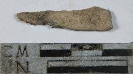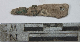 | Description / विवरण | Fragment piece of copper point with pointed at one end and flattened at other end, showing rusting and colour is black. |
