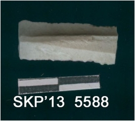 | Description / विवरण | Broken chert blade. It is rectangular in structure and is triangular is cross section on one side and is trapezium in cross section on other side. The ridges can be seen clearly and the sides are retouched. |