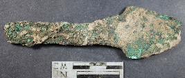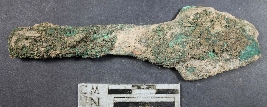 | Description / विवरण | Copper spearhead having pointed head with triangular in shape,showing handle and having platina. |