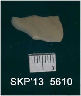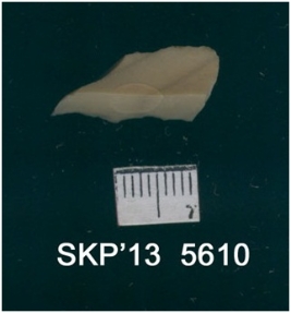 | Description / विवरण | Broken chert blade. It is triangular in cross section. Small flake have been taken out from the side. The ventral surface is plain. |