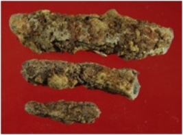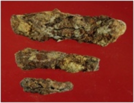 | Description / विवरण | Trench XF 3, Qdt 1, layer 23, depth 1250-1280 cm It is an iron arrow head, broken in three pieces. Badly deformed and corroded. Sharp tip is present. |
