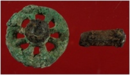 | Description / विवरण | Trench XF 3, Qdt 1, layer 23, depth 1250-1290 cm It is a broken wheel of copper. It has eight spokes are present in it with broken hub. Hard patina is present on the object. |