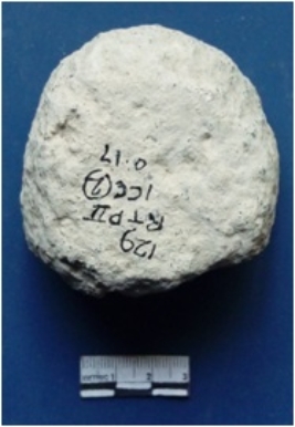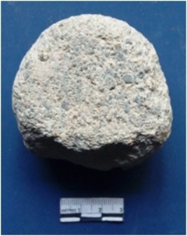 | Description / विवरण | It is a piece of a quern, broken. Very gritty on the surface. Calcinated on one side of the stone. Rounded in shape. |