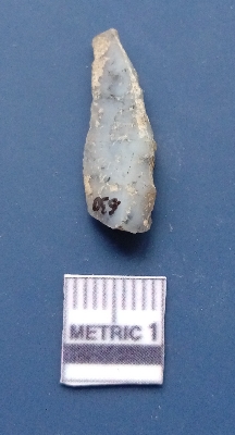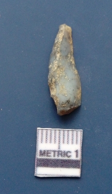 | Description / विवरण | It is a blade fragment with two sharp parallel sides and lateral margin with the working edges. The bulb of percussion is present ventral side with ripple on it due to flaking. It has flake scars on the surface. |