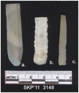 | Description / विवरण | Broken chert blade, rectangular in structure and triangular in cross section. The ridges can be seen clearly and the sides are retouched, the ventral surface is plain. |
