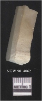 | Description / विवरण | It is a chert blade fragment, the ridges are clearly seen on the dorsal surface. The ventral surface is plain. The sides are sharp and retouched. It is triangular in cross section. |