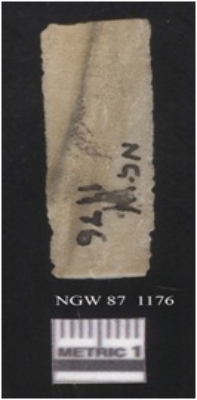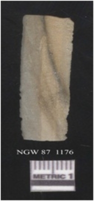 | Description / विवरण | It is a chert blade fragment, the ridges are clearly seen on the dorsal surface. The ventral surface is plain. The sides are sharp and retouched. It is rectangular in shape. It is triangular in cross section. |