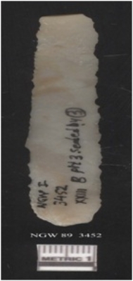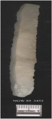 | Description / विवरण | It is a chert blade fragment, the ridges are clearly seen on the dorsal surface. The ventral surface is plain. It is long and rectangular in shape. The sides are sharp and retouched and the striking platform is clearly seen. The bulb of percussion is clearly seen on the ventral surface. |