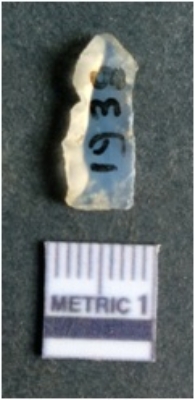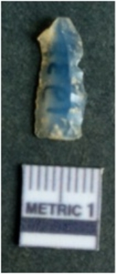| Description / विवरण | The lithic blade is flaked with retouched sides and shows flake scars on the surface. The blade shows a prominent bulb of percussion. |