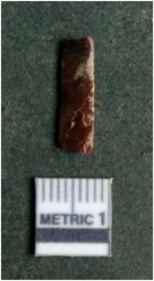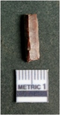 | Description / विवरण | The lithic blade is flaked with retouched sides and shows flake scars on the surface. The blade shows a prominent bulb of percussion. |