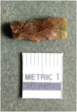 | Description / विवरण | The lithic blade is flaked with retouched sides and shows flake scars on the surface. The blade shows a prominent bulb of percussion. |