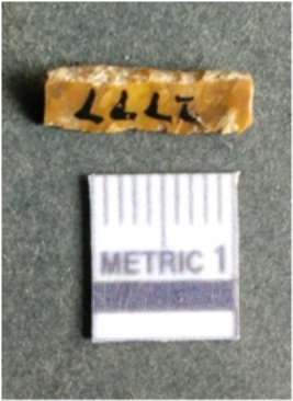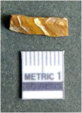 | Description / विवरण | The lithic blade is flaked with retouched sides and shows flake scars on the surface. The blade shows a prominent bulb of percussion. |