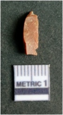 | Description / विवरण | The lithic blade is flaked with retouched sides and shows flake scars on the surface. The blade shows a prominent bulb of percussion. |