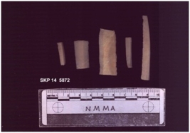 | Description / विवरण | Broken piece of chert blade. Both the edges are sharp and ridges can be seen. It is edges are reworked and trapezium in cross section. |