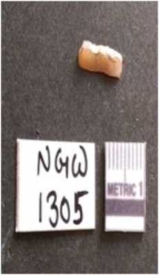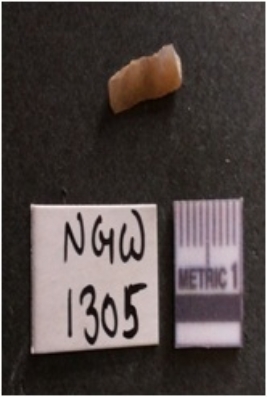 | Description / विवरण | This is a small fragment of chalcedony blade. Elongated and rectangular in shape. Translucent with flaked ridges and sharp edges. Broken ends. |