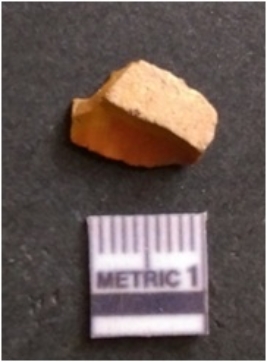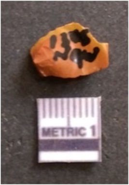 | Description / विवरण | This is a small flake of chert stone, one end tapered and broken at the tip. There is a bulb of percussion at this end and irregular marks are seen with sharp edges. A small fraction of cortex is visible. |