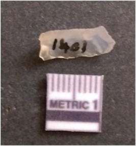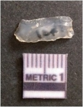 | Description / विवरण | This is a chalcedony blade with broken end. Rectangular in shape. Flaked and ridges with sharp margins, transparent. |