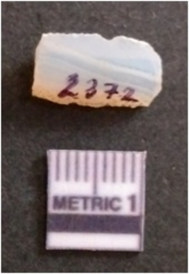 | Description / विवरण | This is a chalcedony blade, rectangular in shape, retouched and translucent. Flaked and ridged. Margins are not sharp. |