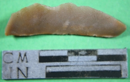 | Description / विवरण | Brownish grey parallel sided blade tool having single ribbed with mark of secondary flaking one end is truncated where as another is convex and comparatively narrow edges, triangular in section. |