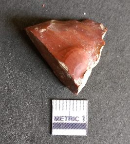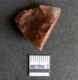 | Description / विवरण | It is a Jasper flake with a negative bulb of percussion on the proximal end. The material is cryptocrystalline and has sharp edges as a result of flaking. The flake is most likely a bi-product of core reduction or retouching process. |
