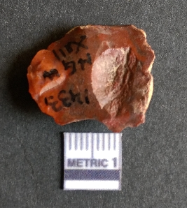 | Description / विवरण | It is a Jasper flake with a negative bulb of percussion on the proximal end. The material is cryptocrystalline and has sharp edges as a result of flaking. The flake is most likely a bi-product of core reduction or retouching process. |