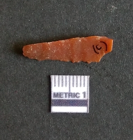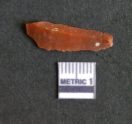 | Description / विवरण | It is a Jasper flake with a negative bulb of percussion on the proximal end. The material is cryptocrystalline and has sharp edges as a result of flaking. The flake is most likely a bi-product of core reduction or retouching process. |
