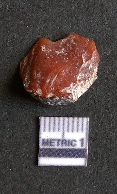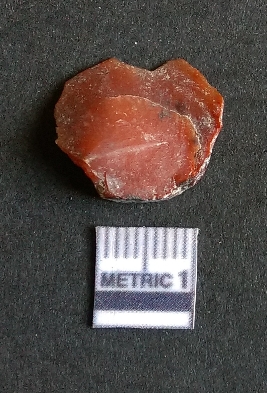 | Description / विवरण | It is a Jasper flake with a negative bulb of percussion on the proximal end. The material is cryptocrystalline and has sharp edges as a result of flaking. The flake is most likely a bi-product of core reduction or retouching process. |
