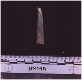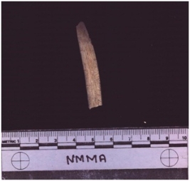 | Description / विवरण | Bone object. It is long, elongated and broken. Some blue color patches can be seen. It is shaped in cross section. It is scooped. |